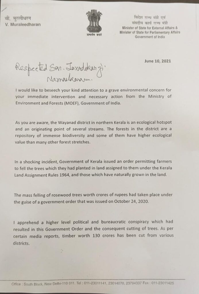 ന്യൂഡല്ഹി: മുട്ടില് മരംമുറിക്കേസില് കേന്ദ്ര വനം പരിസ്ഥിതി മന്ത്രാലയത്തിന്റെ ഇടപെടല് ആവശ്യപ്പെട്ട് കേന്ദ്ര വിദേശകാര്യ സഹമന്ത്രി വി.മുരളീധരന് കേന്ദ്രമന്ത്രി പ്രകാശ് ജാവഡേക്കറിന് കത്ത് നല്കി.