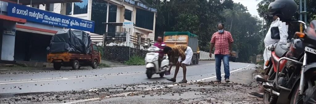 മൂവാറ്റുപുഴ കോട്ടയം എം സി റോഡില് കൂത്താട്ടുകുളം പോകുന്ന വഴിയില് ഈസ്റ്റ് മാറാടി എസ് ബി.ഐ ബാങ്കിന് മുന്വശത്തെ റോഡില് കനത്ത മഴയെ തുടര്ന്ന് വലിയ മെറ്റല് കല്ലുകള് നിറഞ്ഞു. വശങ്ങളില് നിന്ന് ഒഴുകിയെത്തിയ വലിയ കല്ലുകളും മെറ്റലും മണലും റോഡിന്റെ നടുവില് കുന്നുകൂടിയത് ഇരുചക്രവാഹനക്കാര്ക്ക് അപകട ഭീഷണിയായി. നിരവധി വാഹനങ്ങള് തെന്നി വീഴാന് പോയതും വാഹനങ്ങളുടെ ടയര് ഈ കല്ലുകളില് കയറുമ്പോള് തെറിച്ച് വശങ്ങളിലുള്ള കടകളില് പതിച്ച് അപകടങ്ങള് ഉണ്ടാകുകയും ചെയ്തു.