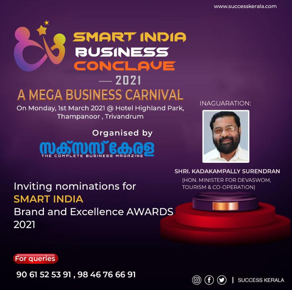 സ്മാര്ട്ട് ഇന്ത്യ ബിസിനസ്സ് കോണ്ക്ലേവ് 2021 ദേവസ്വം, ടൂറിസം, കോ-ഓര്പ്പറേഷന് വകുപ്പ് മന്ത്രി കടകംപള്ളി സുരേന്ദ്രന് ഉദ്ഘാടനം ചെയ്യും. കേരള നിയമസഭാ ഡെപ്യൂട്ടി സ്പീക്കര് വി. ശശി, മുന് മന്ത്രിയും, സക്സസ് കേരളയുടെ രക്ഷാധികാരിയുമായ വി. സുരേന്ദ്രന് പിള്ള, കേരള ഭാഷാ ഇന്സ്റ്റിറ്റ്യൂട്ട് മുന് ഡയറക്ടറും, സക്സസ് കേരളയുടെ രക്ഷാധികാരിയുമായ ഡോ. എം. ആര്. തമ്പാന്, കേരളാ ഫിനാന്ഷ്യല് കോര്പ്പറേഷന് ചീഫ് മാനേജര് സജിത ജി നാഥ്, ഭാരത് ഭവന് മെമ്പര് സെക്രട്ടറി പ്രമോദ് പയ്യന്നൂര്, കേരള ചേംബര് ഓഫ് കൊമേഴ്സ് വൈസ് പ്രസിഡന്റ് താജ് ബഷീര്, KSSIA തിരുവനന്തപുരം ജില്ലാ കമ്മിറ്റി പ്രസിഡന്റ് മധു രാമാനുജന്, ചലച്ചിത്ര നടന് സെന്തില് കൃഷ്ണ എന്നിവര് ചടങ്ങില് വിശിഷ്ട സ്ഥാനങ്ങള് അലങ്കരിക്കും.