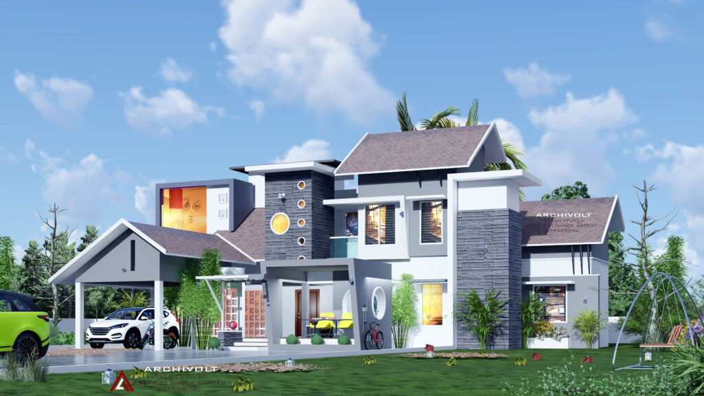 ഒറ്റനോട്ടത്തില് ഇതുപോലുള്ള മറ്റ് വീടുകള്ക്ക് സമാനമായി തോന്നുമെങ്കിലും, ഇവയ്ക്ക് അവയില് നിന്നെല്ലാം വളരെയധികം പ്രത്യേകതകളുണ്ട്. നിര്മിതിയുടെ തുടക്കം മുതല് നിര്മാണത്തിന്റെ ഓരോ ഘട്ടത്തിലും മികച്ച രീതിയിലാണ് 3400 സ്ക്വയര് ഫീറ്റിലുള്ള ഈ വീട് രൂപകല്പന ചെയ്തിട്ടുള്ളത്. ഭംഗിയുള്ള മുന്വശവും വിശാലമായ മുറ്റവും തുടങ്ങി ഒളിച്ചു വെച്ചിട്ടുള്ള ഹിഡന് കിഡ്സ് പൂള് വരെ ഈ ഭവനത്തിലുണ്ട്. വീടിന്റെ മുന്വശത്തേക്ക് കടന്നു ചെല്ലുമ്പോള് അടിയിലൂടെ ഒഴുകുന്ന നദി പോലെയുള്ള ഈ നിര്മിതി ഒന്നുമാത്രം മതി, ഈ ഭവനത്തിന്റെ സവിശേഷത മനസ്സിലാക്കാന്.